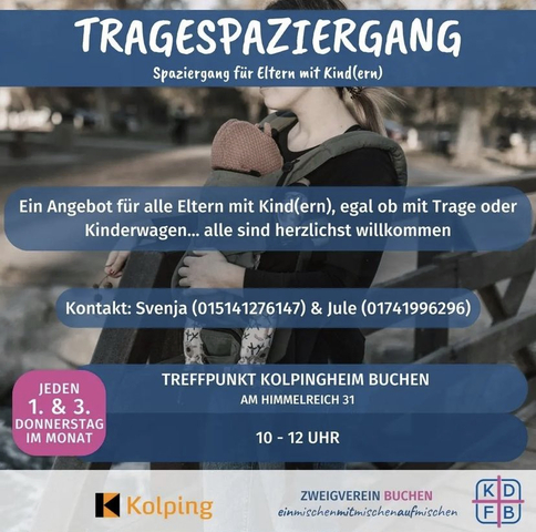Viele Eltern genießen heutzutage die Nähe zu ihrem Kind und die Vorteile, die es mit sich bringt, ihr Baby am Körper zu tragen. Daher bietet die Kolpingsfamilie zusammen mit dem Frauenbund ab Mai 2022 wieder regelmäßig einen sogenannten Trage - Spaziergang an, mit dem Ziel, jungen Eltern ein Angebot zur Vernetzung zu bieten.